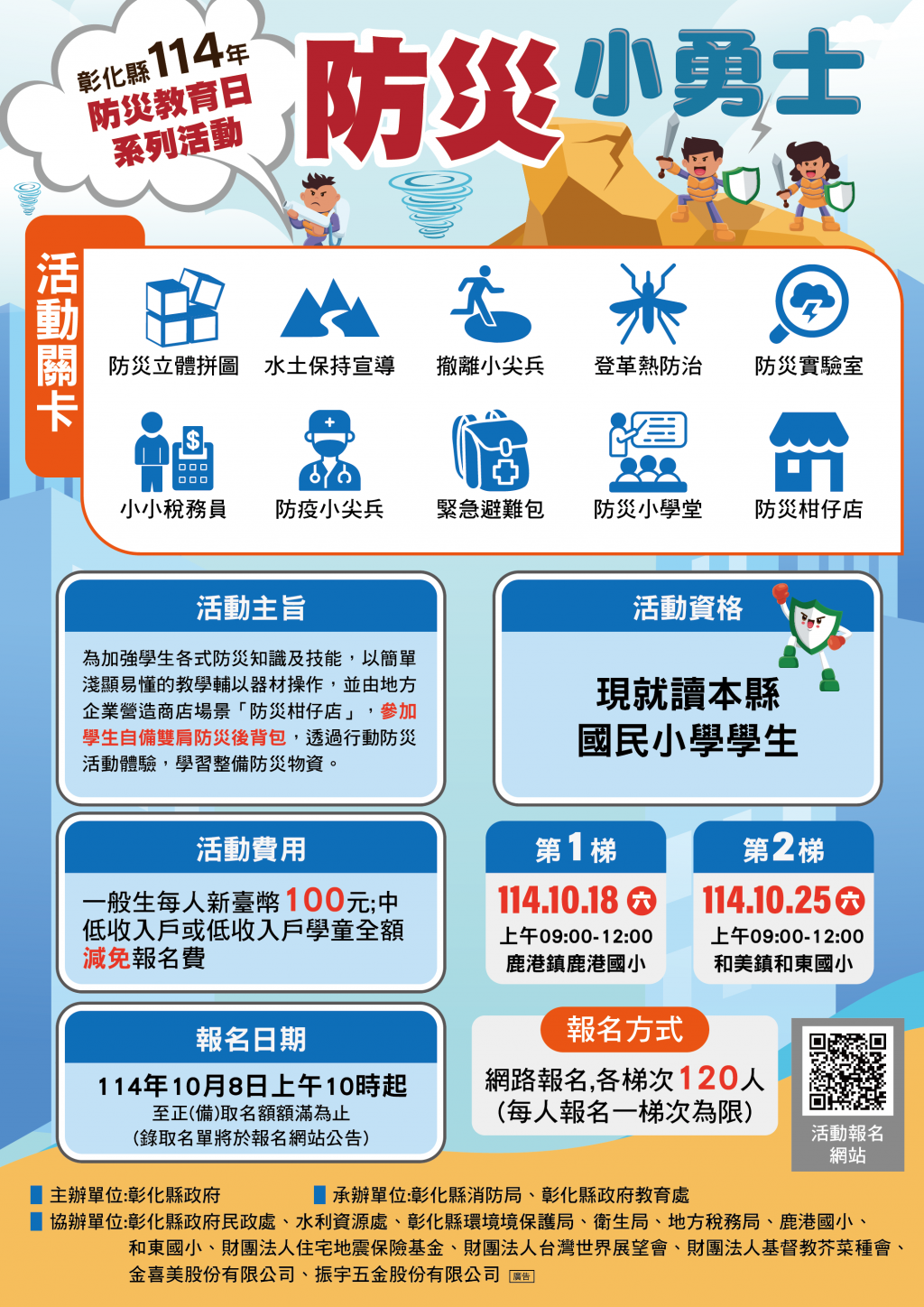 轉知 彰化縣政府舉辦114年防災教育日系列活動「防災小勇士」及「災民夜宿體驗」活動,鼓勵踴躍報名參加。