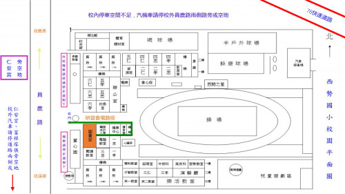 (二) 西勢國小校內停車空間不足,汽機車請停校外員鹿路兩側路旁或空地(如停車示意圖)。
