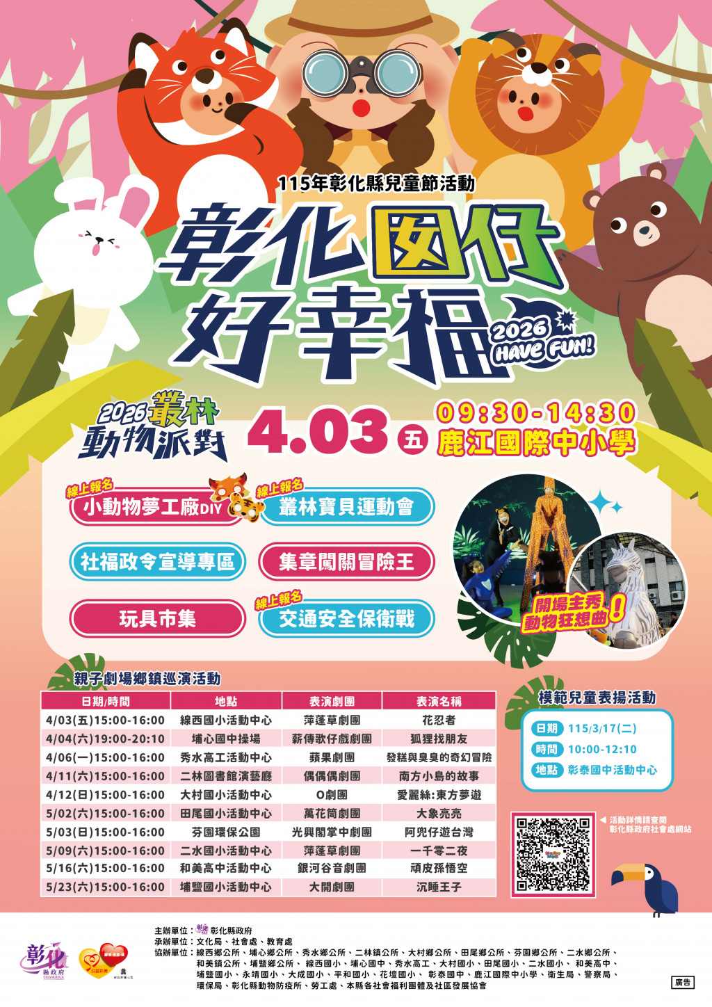 轉知 彰化縣政府為慶祝115年兒童節,規劃辦理「彰化囡仔好幸福-2026叢林動物派對」活動,歡迎參加!!!